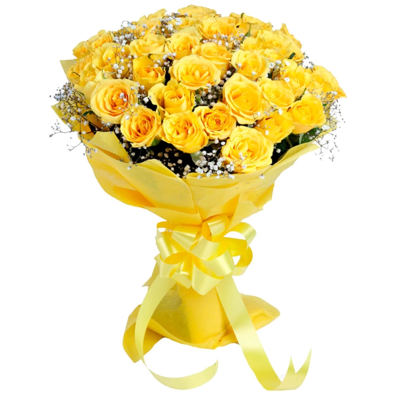 Букет состоит из 45 желтых роз, 4 ветки гипсофилы, красивая упаковка, атласная лента.