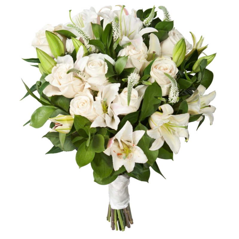Букет состоит из 9 белых роз, 4 белые лилии, зелень, прозрачная упаковка, атласная лента.