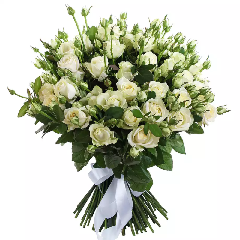Букет состоит из 19 белых кустовых роз, прозрачная упаковка, атласная лента.