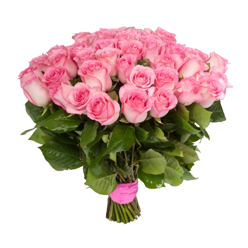 Букет состоит из 55 розовых роз, прозрачная упаковка, атласная лента.